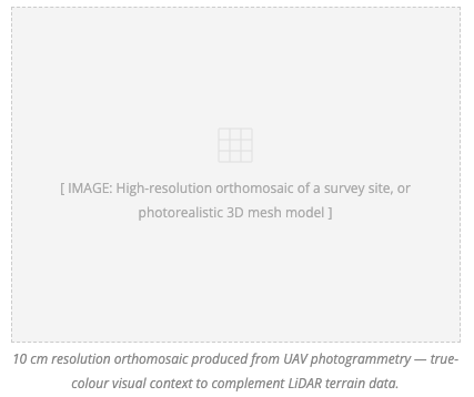 | Orthomosaic | GeoTIFF | 5–10 cm resolution true-ortho image (where photogrammetry is in scope) |