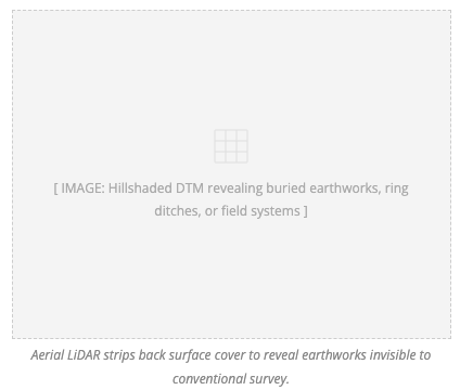 Aerial LiDAR has transformed landscape archaeology. By stripping away surface vegetation to expose bare-earth topography, subtle earthworks become clearly visible at landscape scale — ring ditches, field banks, drove roads, trackways, and mine workings that would be entirely invisible to optical cameras or conventional topographic survey.