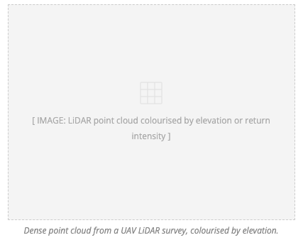 The UAV carries a laser scanning payload that pulses thousands of times per second, measuring the precise distance from the sensor to each surface it strikes. Combined with high-accuracy GNSS positioning and an inertial measurement unit, every point in the resulting cloud carries a georeferenced three-dimensional coordinate.