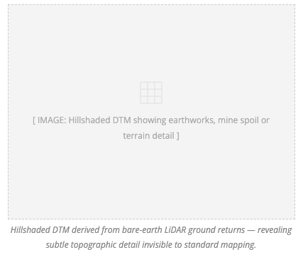 For brownfield characterisation more broadly, LiDAR-derived surface models help quantify earthwork volumes, map surface drainage, identify access constraints, and support planning and environmental impact assessment — at a fraction of the time and cost of conventional methods.