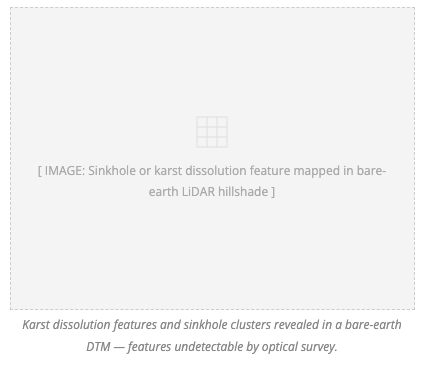 Sinkholes, dissolution features, and ground subsidence associated with karst geology or historical underground workings require rapid, accurate surface characterisation — frequently over terrain that is unsafe to traverse on foot. Aerial LiDAR is the ideal tool.