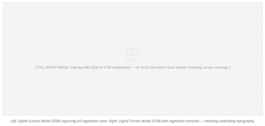 Where the full surface including vegetation and buildings is required — for example for volumetric calculations or flood-routing — a Digital Surface Model (DSM) is derived from the first returns. DTM and DSM are typically delivered together as a complementary pair.