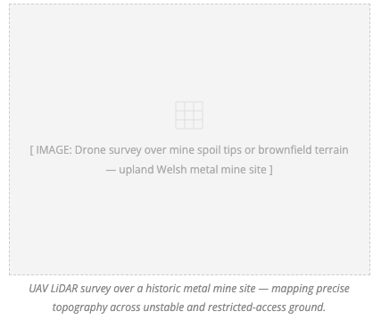 Historic metal mine sites and brownfield land present significant challenges to conventional survey: unstable ground, restricted access, and complex irregular terrain demanding high measurement density. Aerial LiDAR resolves all three simultaneously.